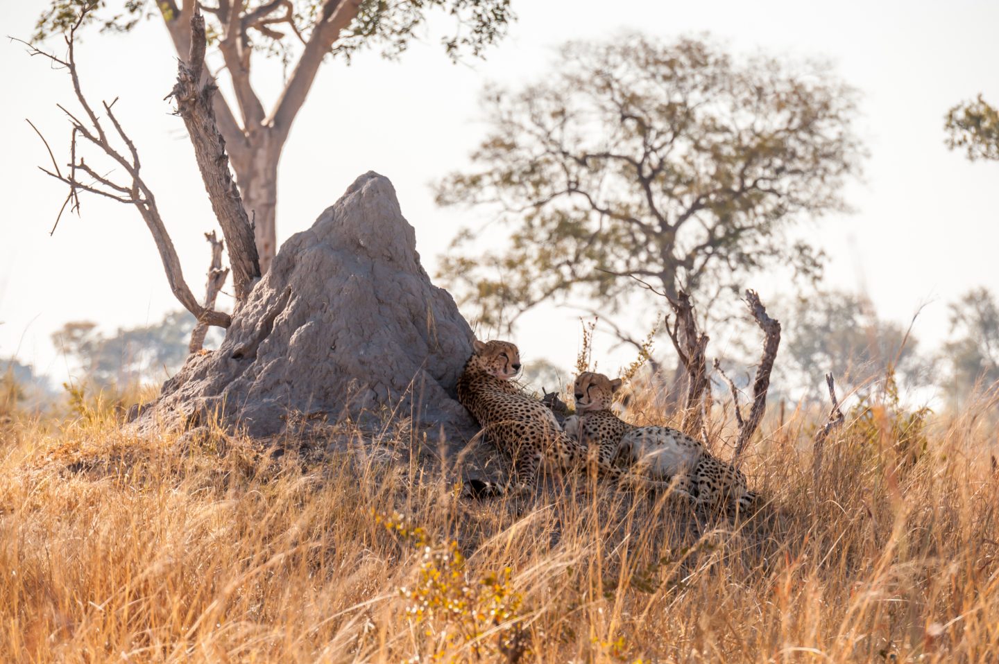 Stavamo rientrando a Somalisa Acacia Camp dopo il sundowner, felici e ancora emozionate per l’incontro con i leoni, quando un’altro veicolo del campo ci ha segnalato un altro avvistamento. Abbiamo raggiunto velocemente il punto, puntato i nostri binocoli ed eccoli lì: due stupendi ghepardi sdraiati su un termitaio.