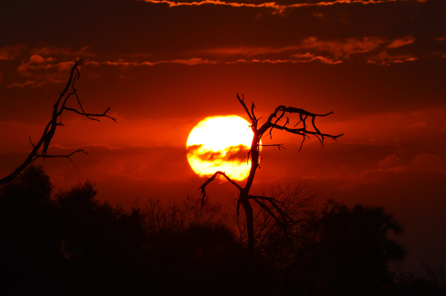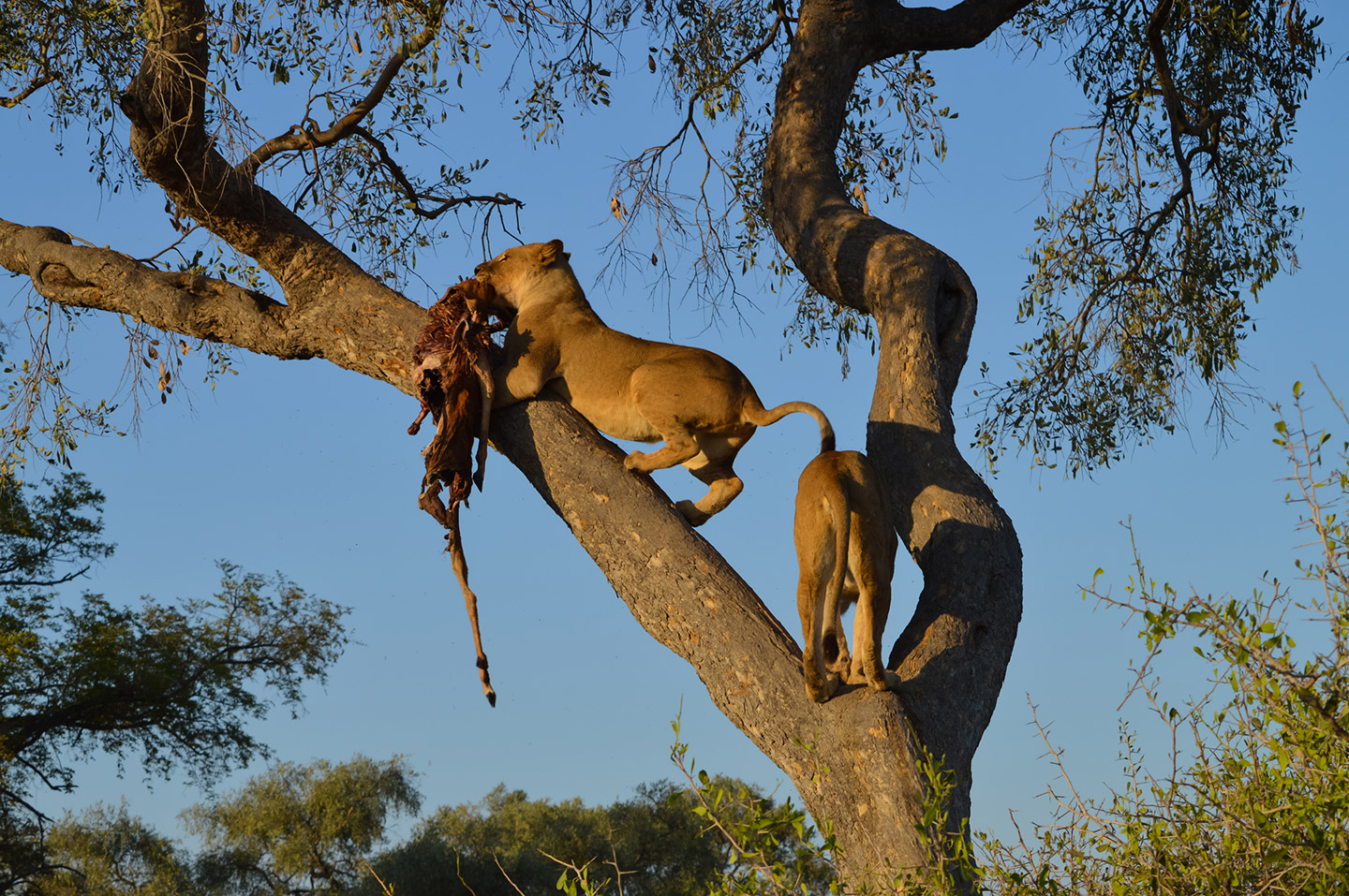 Una mattina, durante un safari a Chitabe Camp, ci siamo imbattuti in due leoni che si sono arrampicati su un albero per rubare un impala cacciato poco prima da un leopardo. Dopo essere scesi goffamente dall’albero, ed essere stati raggiunti dal resto del branco, i leoni hanno fatto colazione con il povero impala.